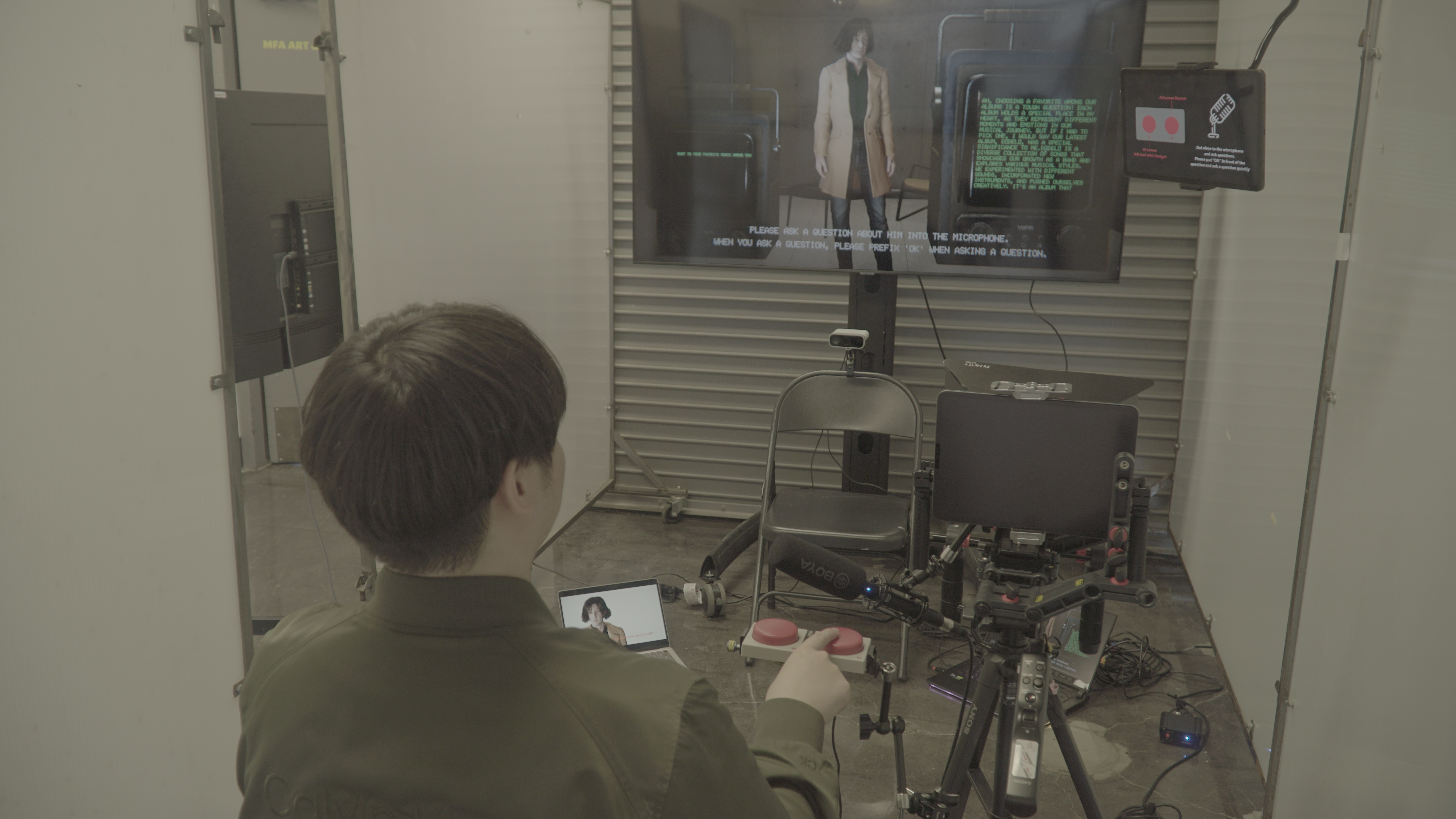 Azure Kinect provided body tracking, gesture detection, and depth information, allowing the AI human to react physically to visitors—leaning, nodding, and mirroring engagement. Audience forms were rendered as 3D point clouds, visualizing how AI perceives human presence.